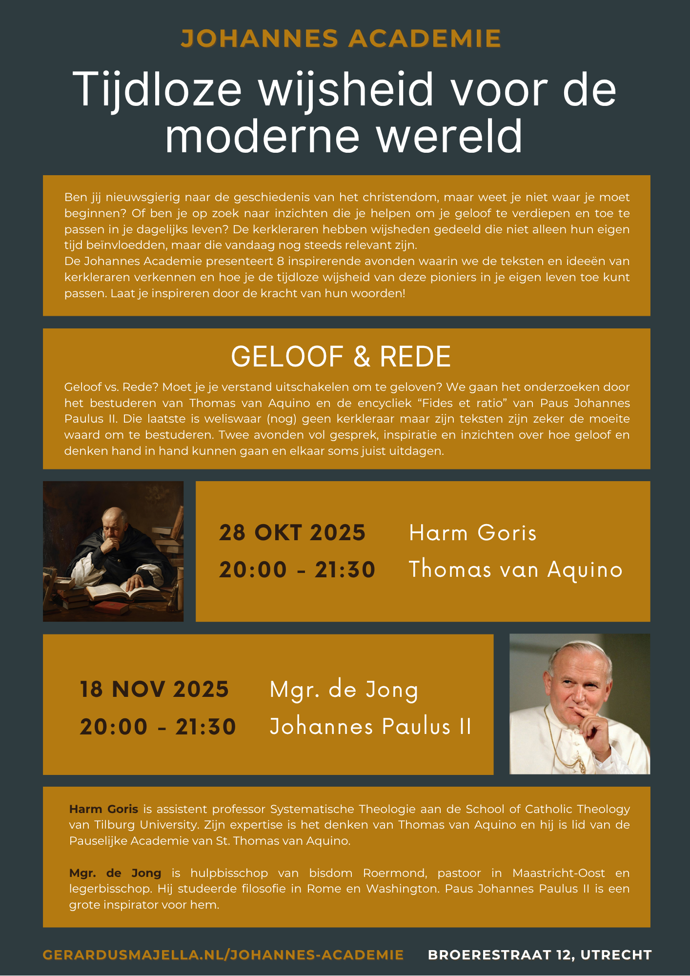 Deze avond hoort bij de cursus “Tijdloze wijsheid voor de moderne wereld” die de Johannes Academie organiseert. Lees hier meer over het jaarprogramma 2025-2026 en de sprekers. De lezing van Harm Goris is deel 1 van het thema Geloof & Rede. De tweede avond van dit thema is op 18 november a.s. en dan komt mgr. de Jong spreken over de encycliek Fides & Ratio van paus Johannes Paulus II. Alle lezingen vinden plaats in het Thomas a Kempis Leerhuis, Broerestraat 12, Utrecht.