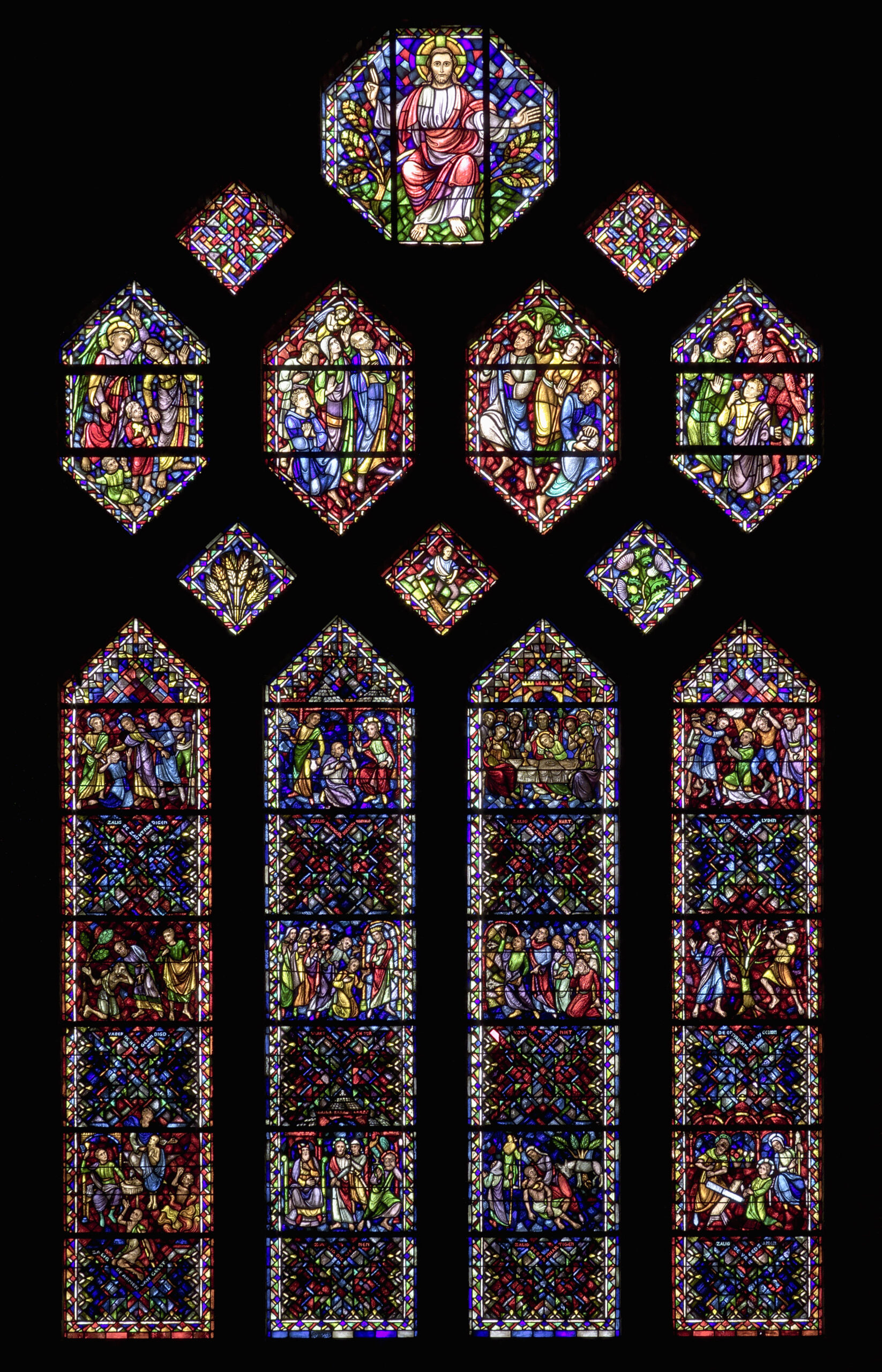 De ramen van het zuidertransept (Vleutenseweg) geven een uitbeelding van de zaligsprekingen weer. Daarboven wordt het Laatste Oordeel uitgebeeld en het raam wordt bekroond door de Christus Pantocrator – Christus de Albeheerser.