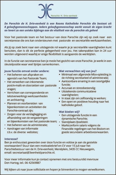 Bekijk de volledige vacature op de website van de H. Drie-eenheid parochie en hieronder: